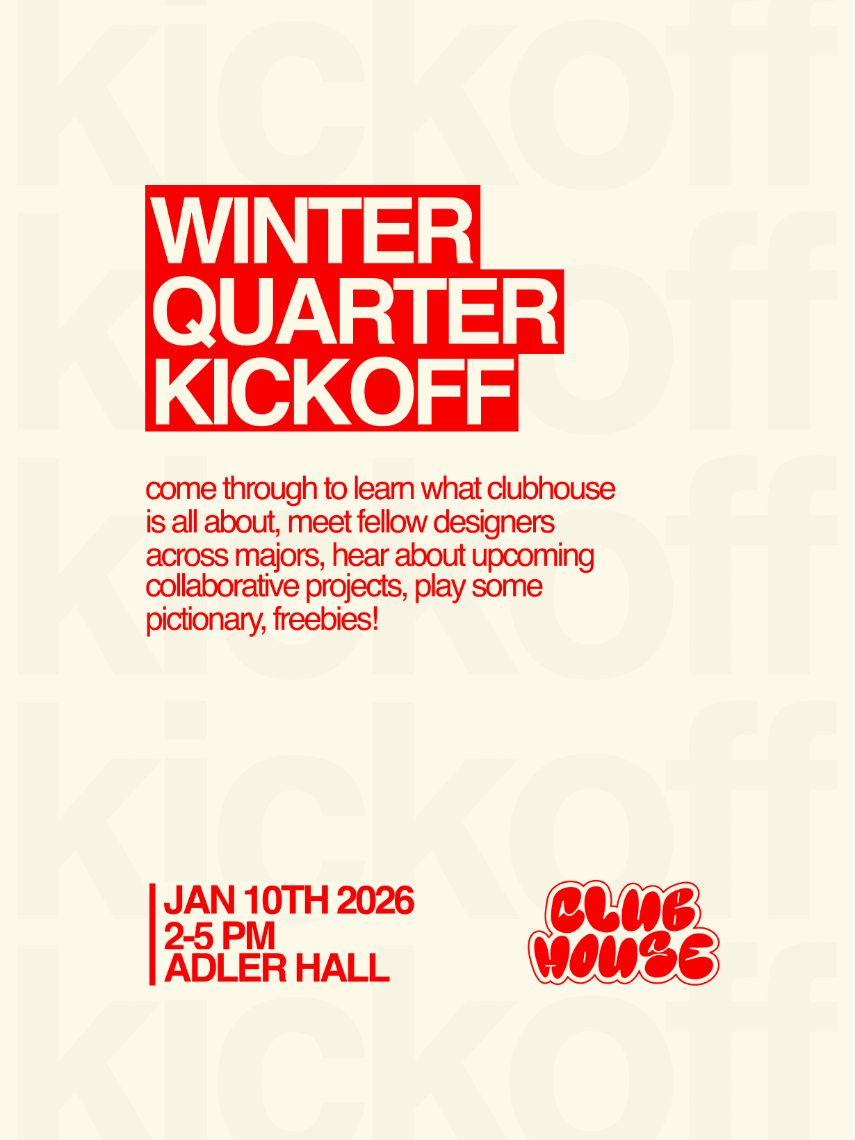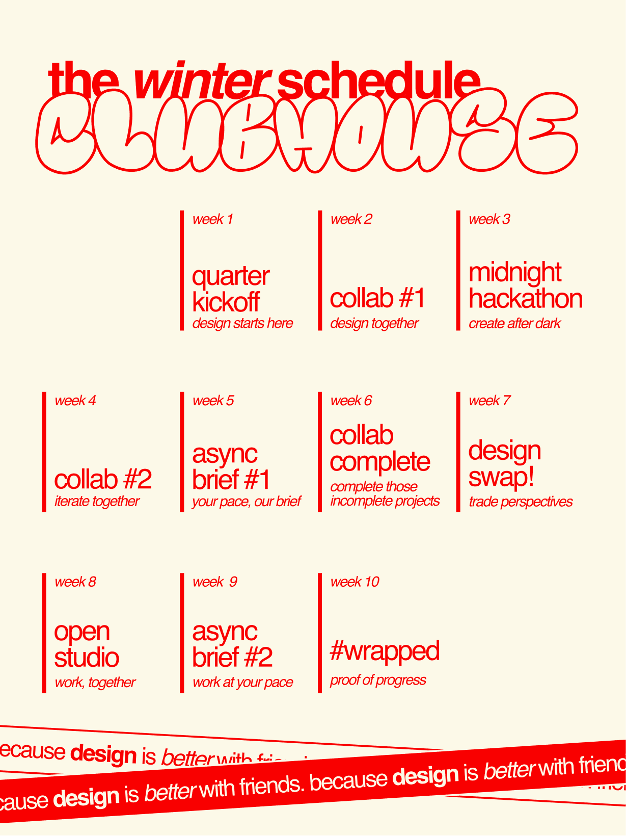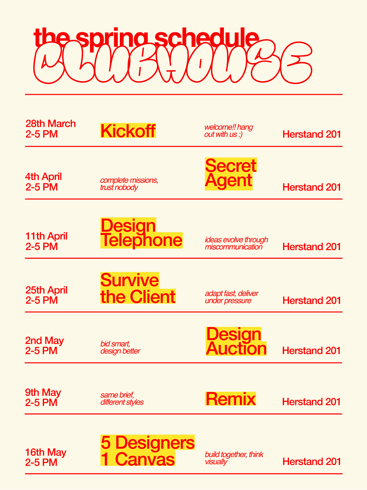 Clubhouse is a student-led portfolio development club focused on collaboration—where designers come together to share work, give feedback, and grow through community.